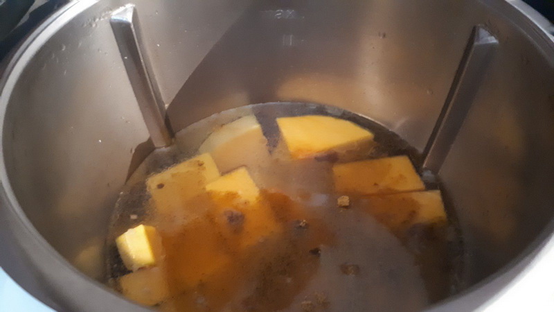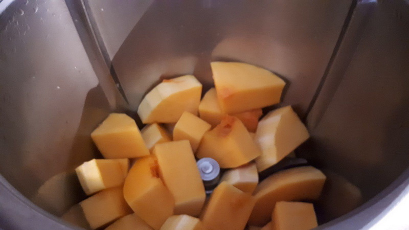 - Peler, épépiner et couper votre courge butternut en petits morceaux, les ajouter dans le bol et faire suer 3min/120°C/vit mijotage.