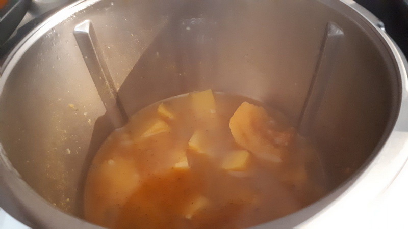 - Couvrir avec l’eau, ajouter le bouillon, le curry puis faire chauffer 18min/Varoma/vit mijotage.
