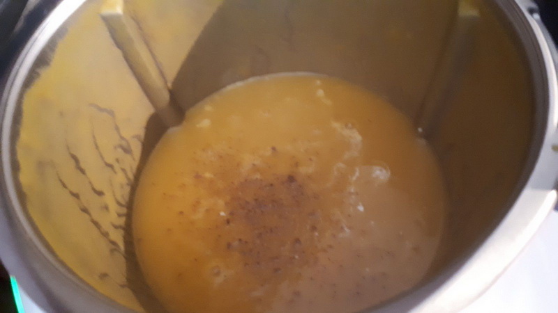 - A la sonnerie, mixer 30sec de la vitesse 6 à 9, ajouter la crème, le sel et le poivre puis mélanger 30sec/vit3.