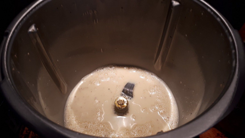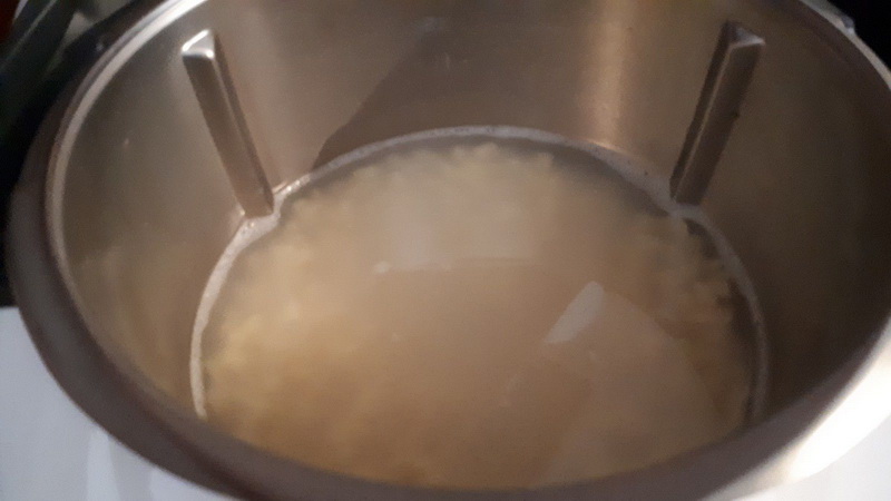 - Faire cuire les pâtes, mettre 1200g d’eau puis faire chauffer 10min/100°C/vit1, ajouter par le trou du couvercle 1 c à c de sel et les pâtes puis faire chauffer 8min/100°C/couteau inversé/vit1, sans le gobelet. A la sonnerie égoutter vos pâtes. Rincer le bol