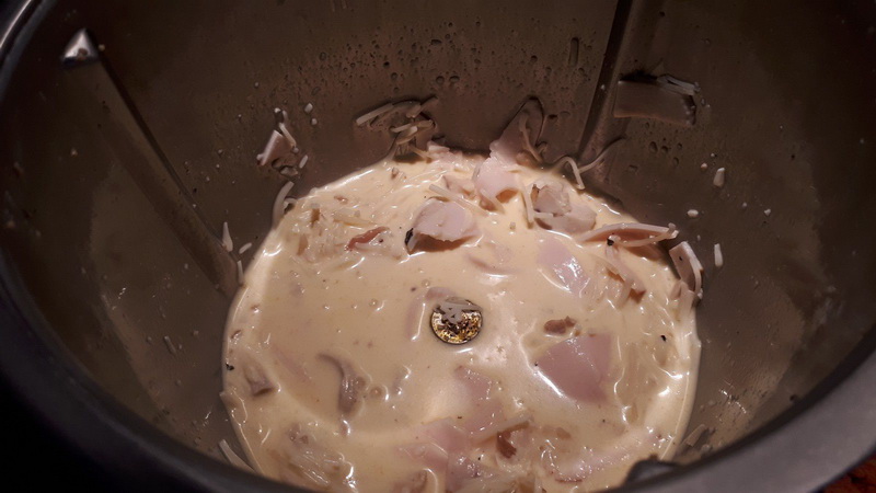 - Mettre dans le bol, les œufs, le lait, la crème, le sel, le poivre, l’ail en poudre puis mélanger 30sec/vit4, ajouter le poulet coupé en petits bouts, le Comté râpé puis mélanger 30sec/couteau inversé/Vit2.