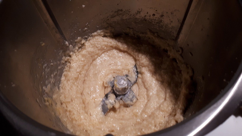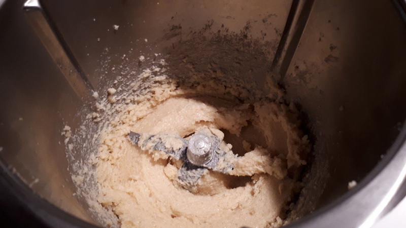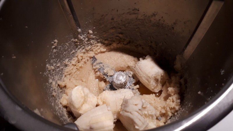 - Mettre le beurre et les sucres dans le bol, puis mélanger 1min/vit3, ajouter l’œuf, l’extrait de vanille et la banane coupée en morceaux mixer 30sec/vit3.
