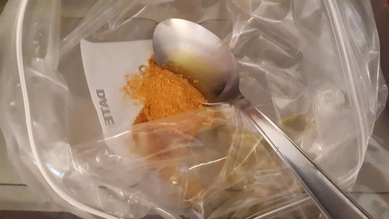 - Mettre dans un sac congélation l’huile d’olive ainsi que le cumin, du sel et du poivre.