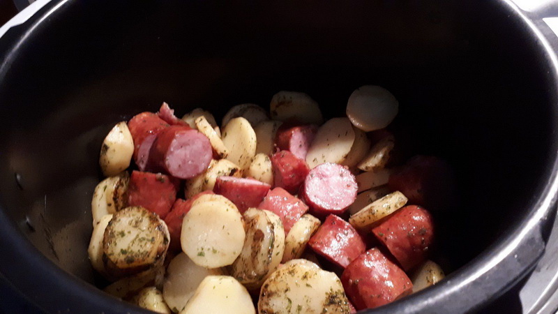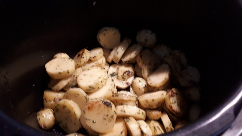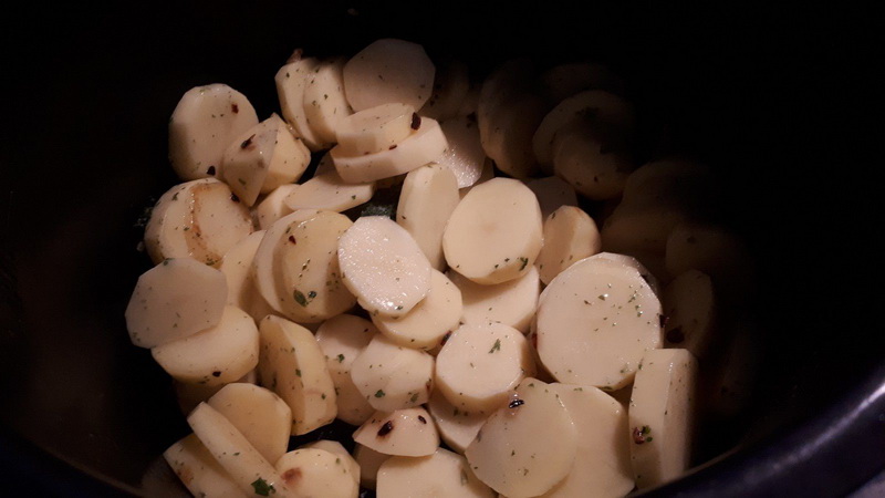 - Mettre votre cookéo en mode dorer, à la moitié du préchauffage mettre votre huile d’olive, vos gousses d’ail, vos pommes de terre, le persil, le sel et le poivre, mélanger, laisser dorer 10 minutes.