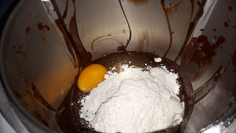 - Inutile de rincer le bol, mettre le beurre coupé en morceaux et vos pistoles de chocolat dans le bol puis faire fondre 4min/60°C/Vit2, ajouter la farine, le sucre, la crème, l’œuf puis mélanger 40sec/vit4.