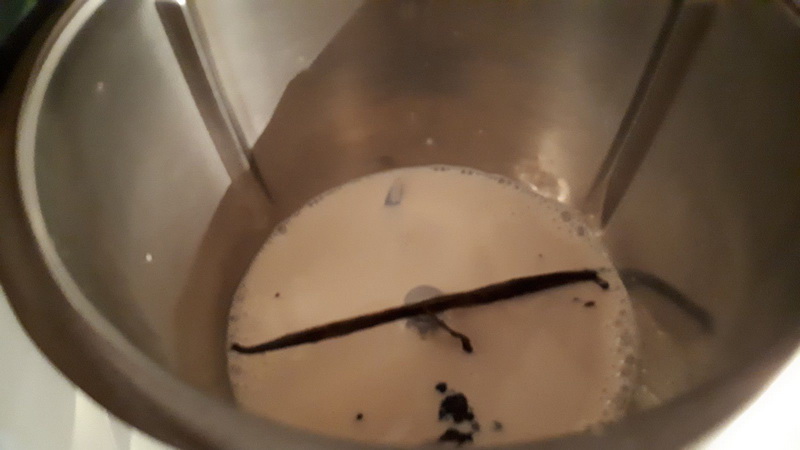 5. Mettre le lait de noisettes et la gousse de vanille fendu en 2 dans votre bol puis programmer 6 min/100°C/couteau inversé/Vit1 ( le temps peut varier selon la température du lait), ajouter le sucre et l’agar agar par le trou du couvercle puis poursuivre 1min30/100°/couteau inversé/vit2, la cuisson.