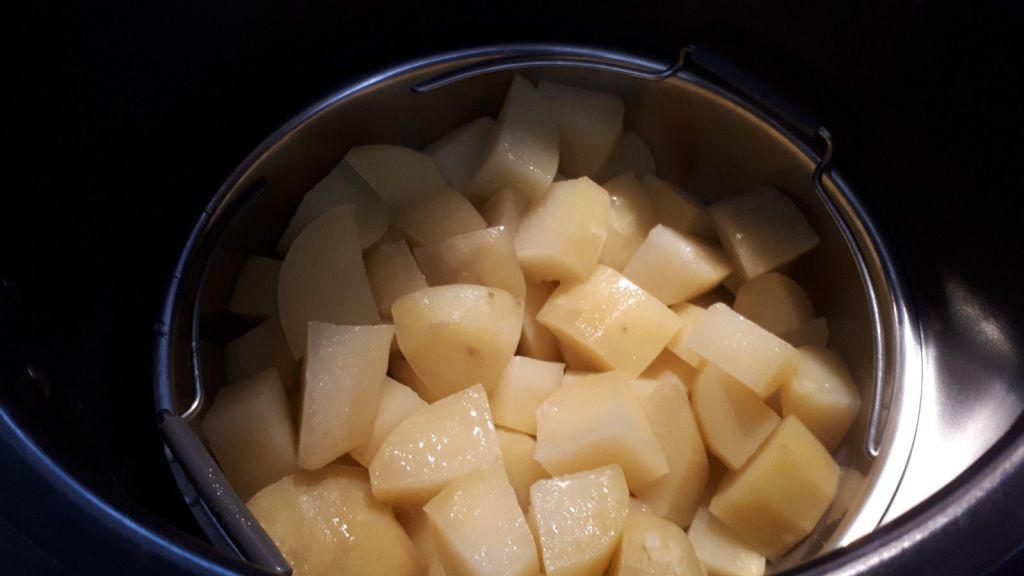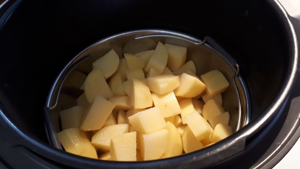 2. Mettre les pommes de terre dans le panier vapeur, l’installer dans le Cookéo, mettre en mode sous pression pour 8 minutes.