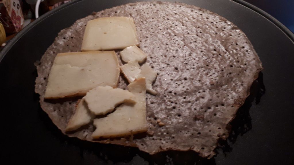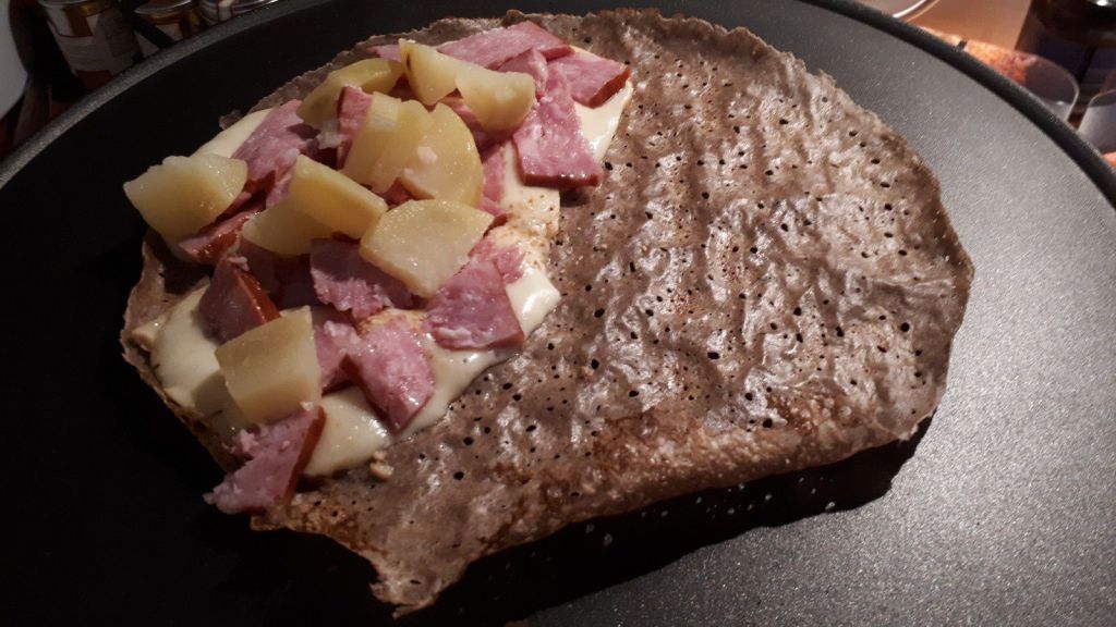 3. Faire chauffer une noix de beurre dans votre crêpière, disposer une galette, répartir 3 tranches de raclette, saupoudre d’un peu d’ail semoule, mettre les pommes de terre, disposer des rondelles de saucisses ou des lanières de jambon, poivrer, refermer la galette et laisser cuire 5 minutes jusqu’à ce que le fromage soit fondu.