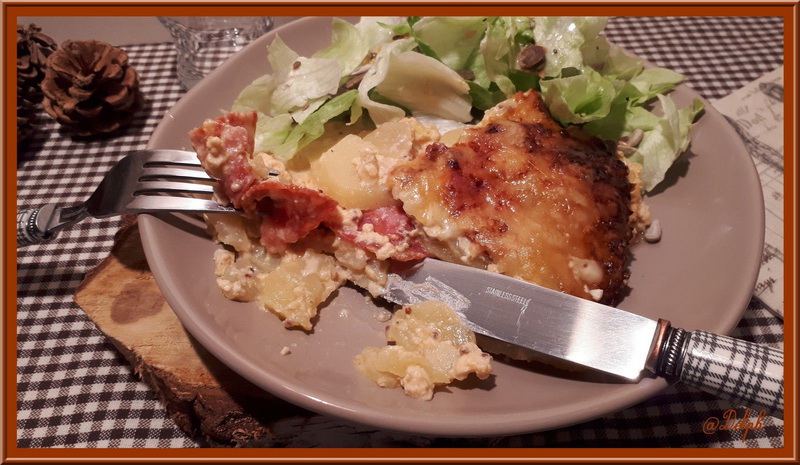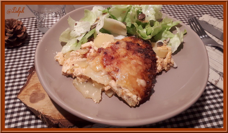Et voici un gratin pour mes hommes, il y a quelques temps j’avais fait un gratin de pommes de terre à la truite, avec lequel nous nous étions régalés. J’ai donc réitéré en changeant certains ingrédients.