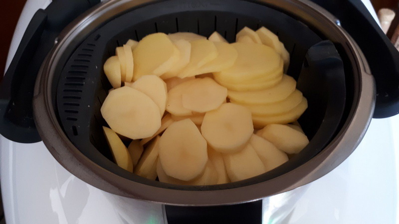 - Peler les pommes de terre, les couper en rondelles et les placer dans le panier cuisson. Mettre 500g d’eau dans le bol du Thermomix avec un peu de sel puis insérer le panier cuisson puis programmer 20min/varoma/vit1, à la sonnerie, ôter le panier à l’aide de la spatule, puis rincer le bol.