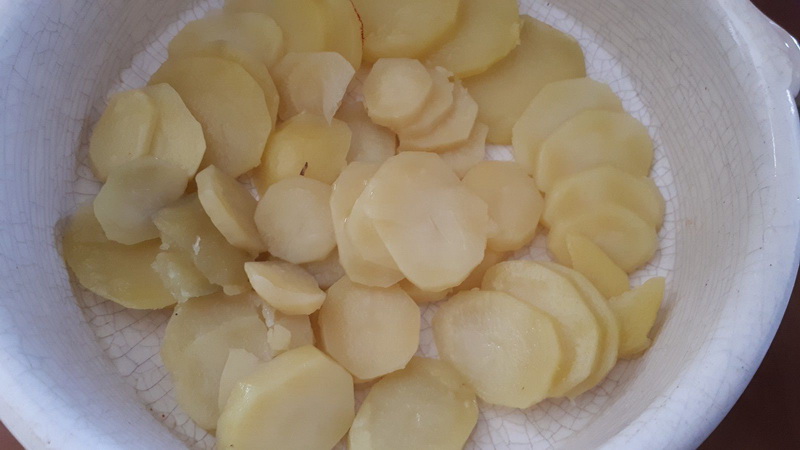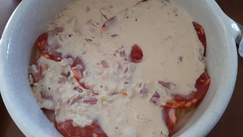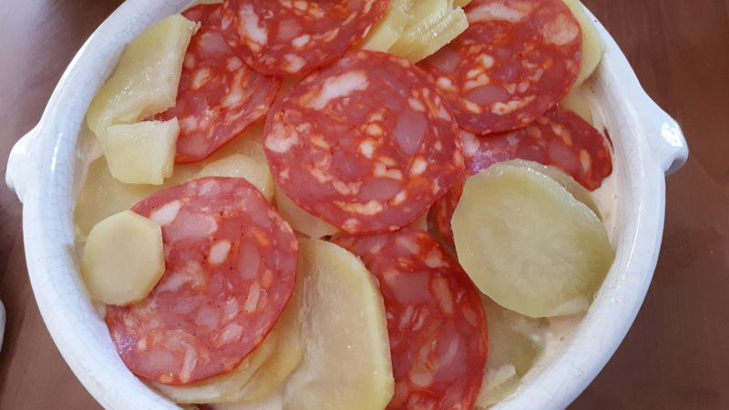 - Disposer une couche de pommes de terre au fond d’un plat à gratin, répartir les tranches de chorizo sur le dessus, mettre un peu de votre préparation à base de crème puis remettre une couche de pommes de terre, de chorizo, de pommes de terre…finir par la préparation à base de crème.