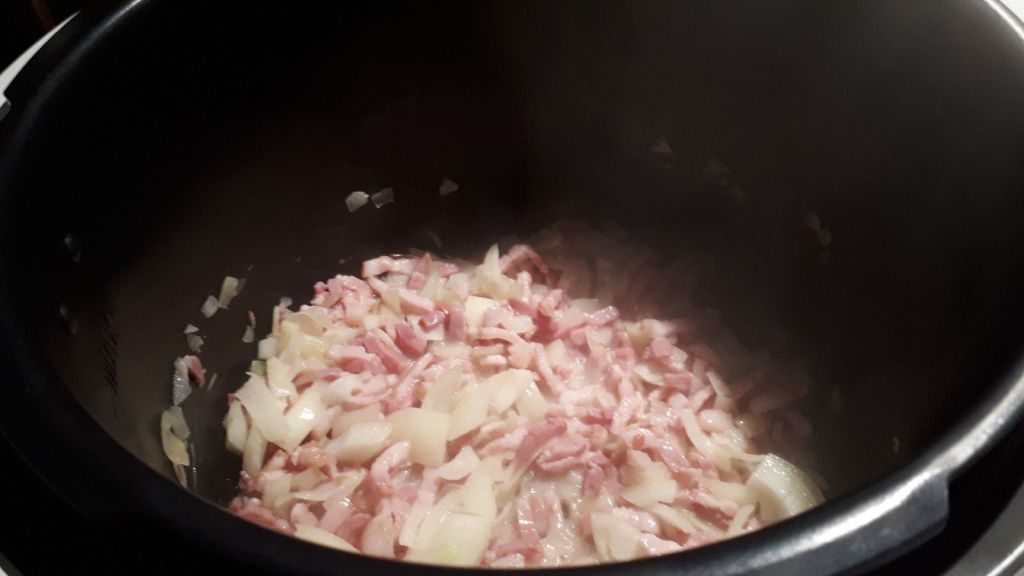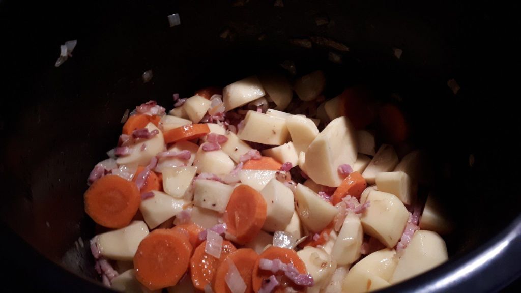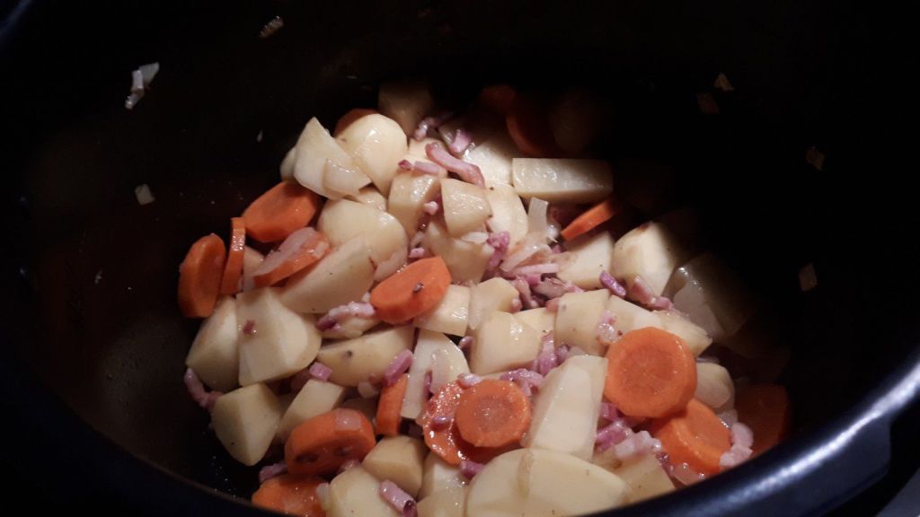 - Mettre votre Cookéo en mode dorer, dès la moitié du préchauffage, déposer vos lardons et vos oignons, mélanger lorsque le cookéo passe en mode dorer déposer, les pommes de terre et la carottes puis laisser dorer 5 minutes toujours en mélangeant.