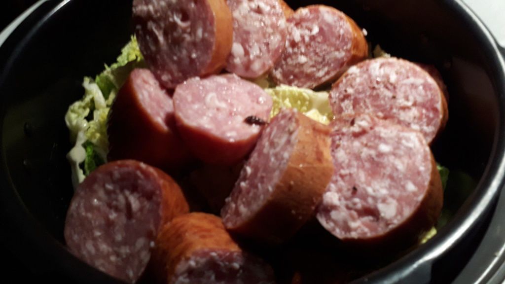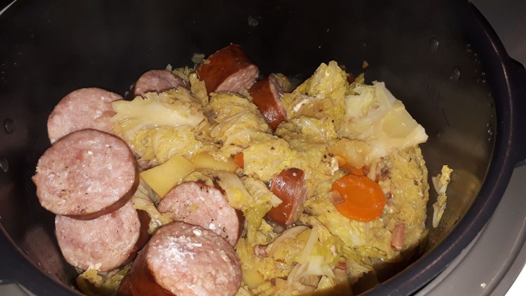 - Ajouter le bouillon de légumes, le chou, et les saucisses, assaisonner avec le sel, le poivre et le mélange trappeur puis passer en mode sous pression pendant 20 minutes.