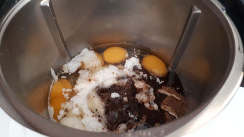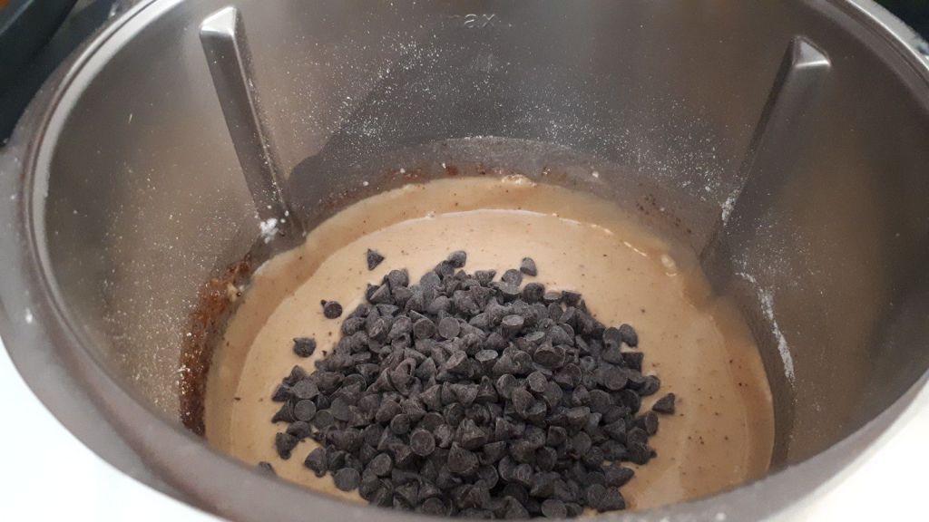 - Verser dans le bol, le fromage blanc, la farine, le sucre, l’huile, les œufs et la levure puis mélanger 40sec/vit4, ajouter les pépites puis mélanger 20sec/couteau inversé/vit3.