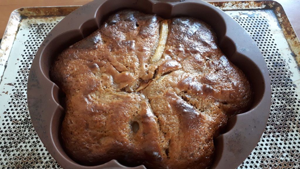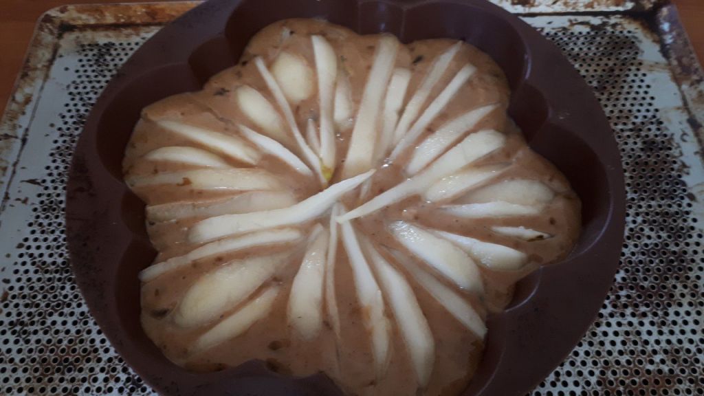 - Verser dans votre moule beurré et fariné ( si il n’est pas en silicone), éplucher et couper finement vos poires, les disposer sur le dessus, en les enfonçant légèrement.