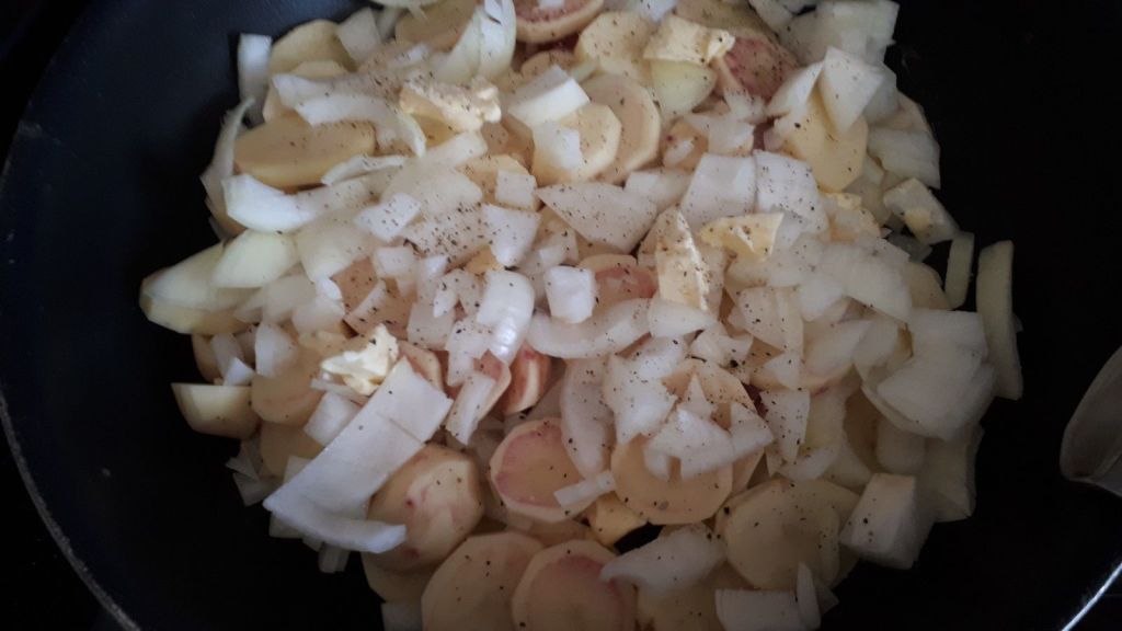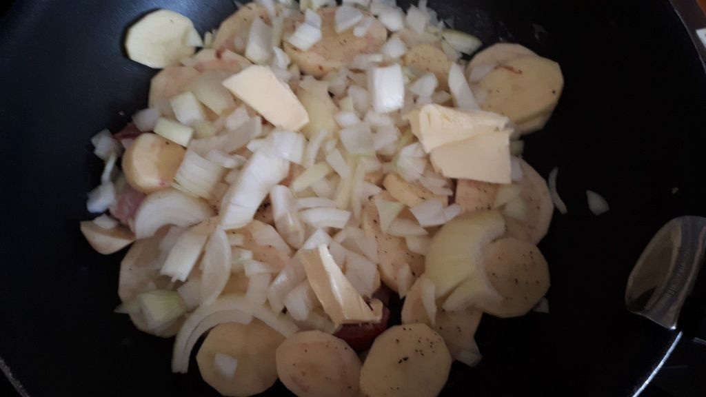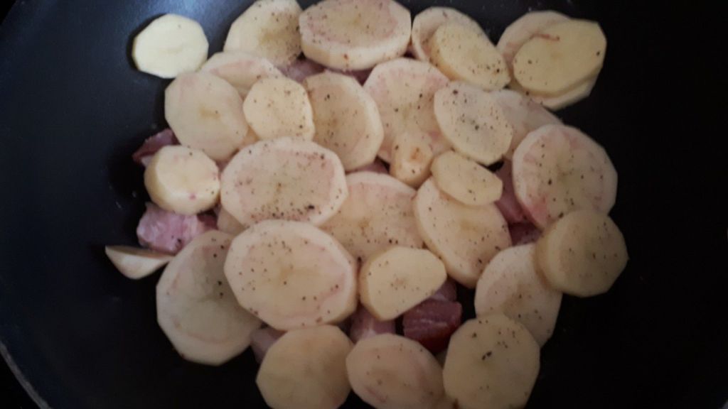- Faire fondre un peu de beurre dans le fond de la cocotte, puis disposer en couche la moitié du lard, et ensuite la moitié des tranches de pommes de terre. Saler, poivrer et ajouter la moitié des oignons et quelques morceaux de beurre.