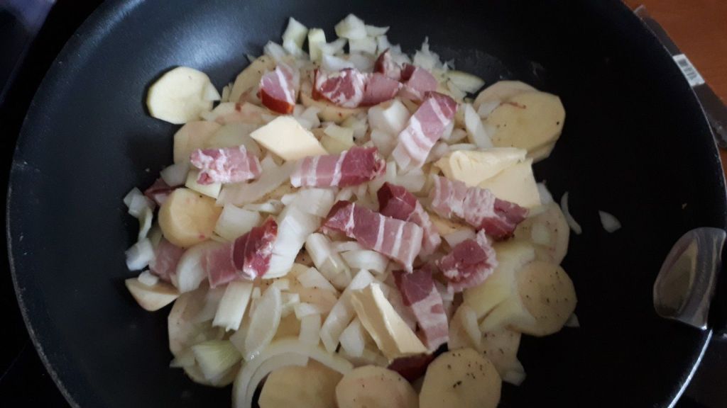 - Terminer ensuite en ajoutant une couche de lard, de pommes de terre et d’oignons. Saler, poivrer et ajouter le reste de beurre coupé en morceaux.