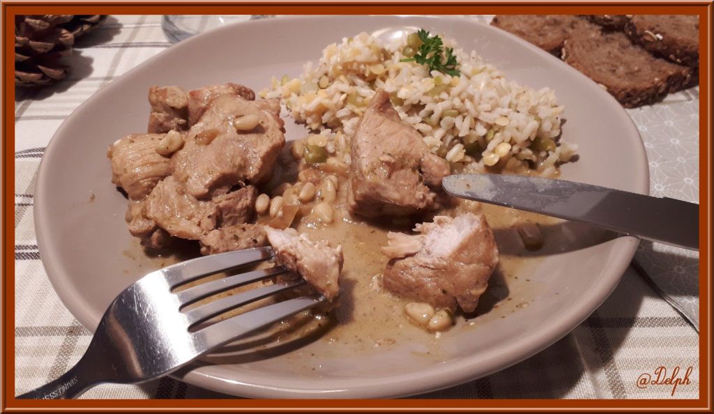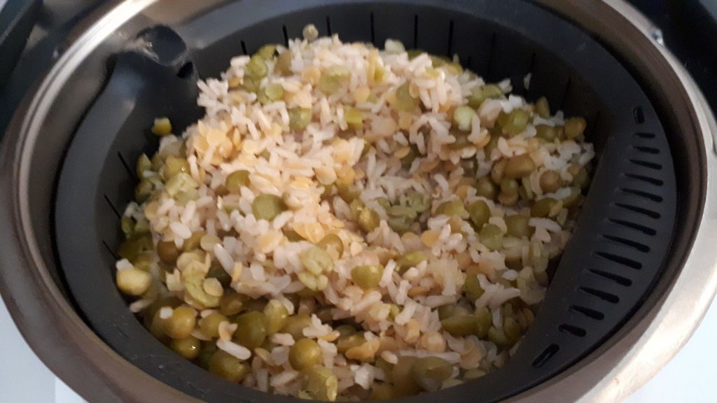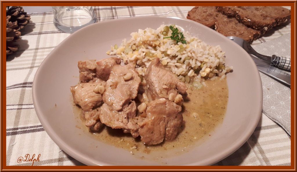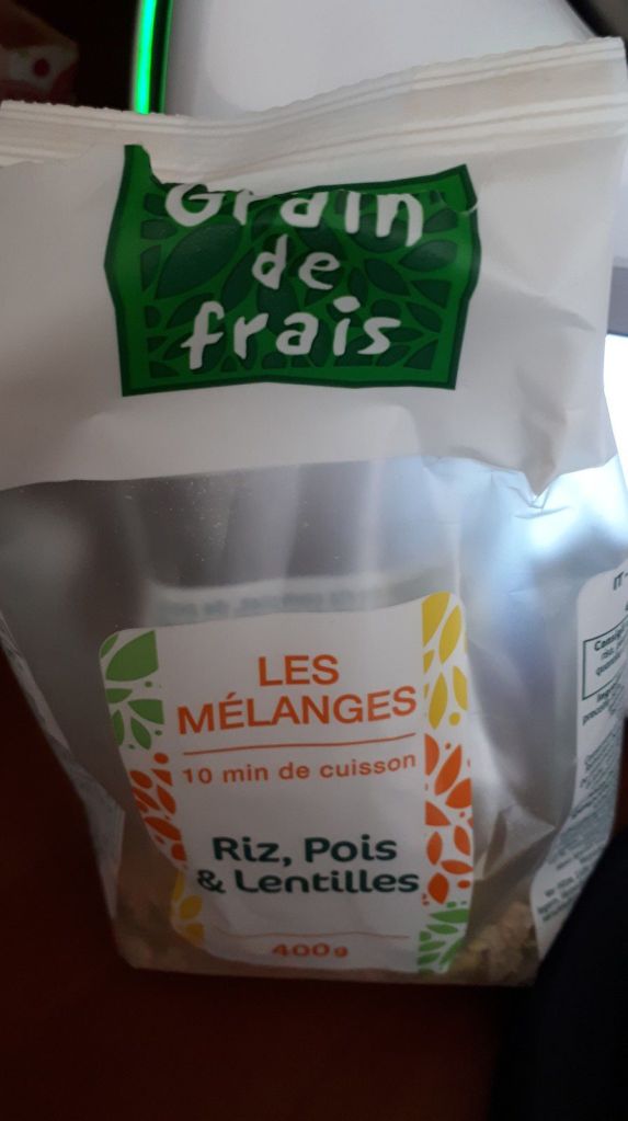 J’ai accompagné mon plat d’un mélange de riz, pois et lentilles, que j’ai trouvé chez Grand frais, mais vous pouvez réaliser une bonne purée maison.
