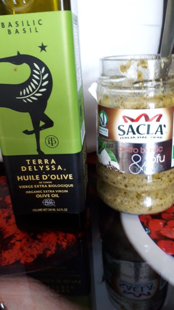 Voici un délicieux plat en sauce, le pesto peut être réalisé maison, j’ai plusieurs recettes sur mon blog aux fanes de carotte, ou au persil, ou au basilic. Le mien m’a été offert au festival des blogueurs culinaires.