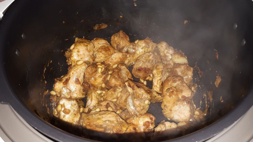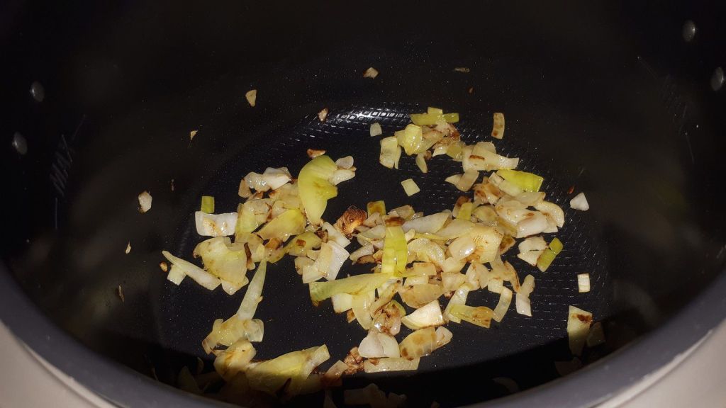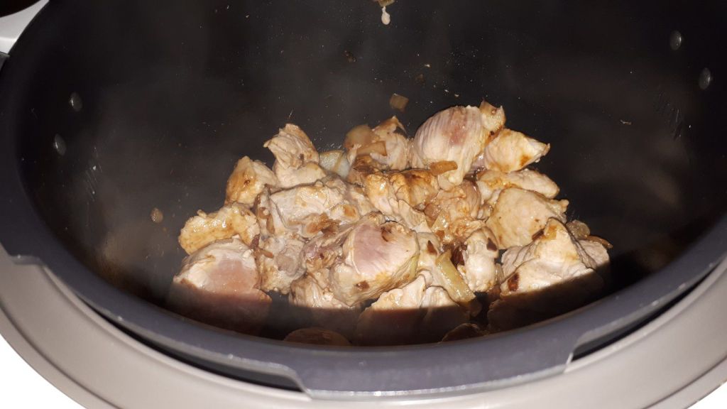 - Éplucher et ciseler votre oignon, lancer le mode dorer, déposer l’oignon dans la cuve dès la moitié du préchauffage avec l’huile puis faire revenir pendant 2 minutes en remuant. Ajouter la viande coupée en gros cubes et les faire dorer 6 minutes, en les retournant régulièrement.