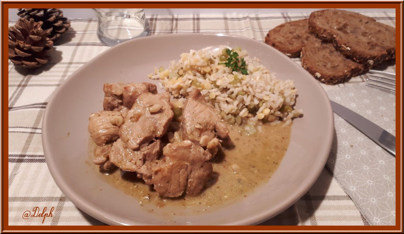 J’ai accompagné mon plat d’un mélange de riz, pois et lentilles, que j’ai trouvé chez Grand frais, mais vous pouvez réaliser une bonne purée maison.