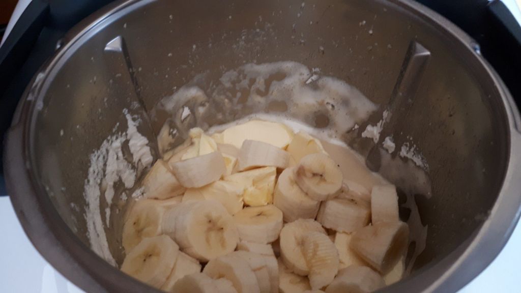 - Ajouter le beurre coupé en morceaux et les bananes puis mélanger 40sec/vit4, ajouter les pépites de chocolat et mélanger 10sec/couteau inversé/vit3.