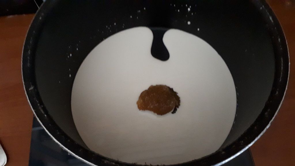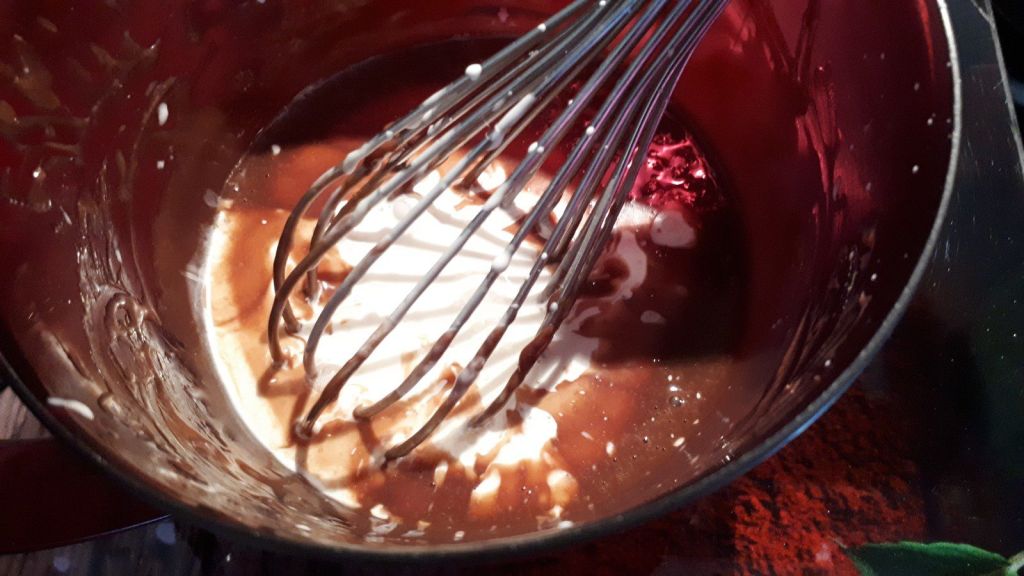 - Faire bouillir 100g de crème liquide avec votre miel, puis verser 1/3 du liquide sur vos pistoles de chocolat, à l’aide d’une maryse mélanger en faisant des petits cercles, pour créer un noyau élastique. Recommencer avec le deuxième tiers puis le dernier.