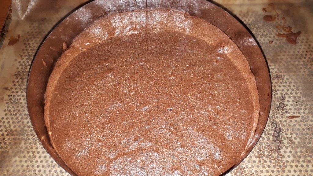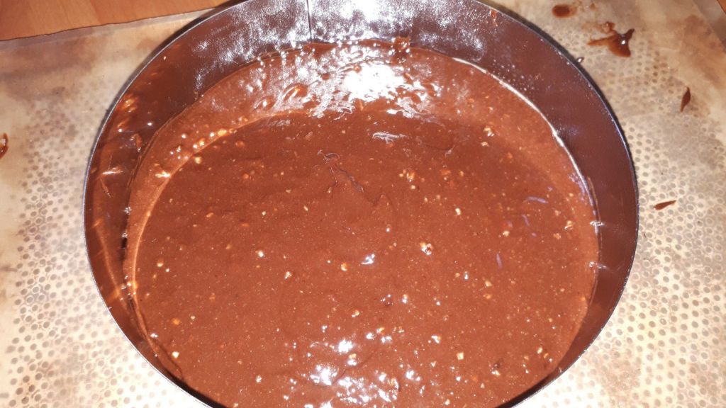 - Poser un cercle à entremets de 22 cm de diamètre beurré, sur une plaque à four recouverte de papier sulfurisé puis verser votre pâte à brownie dedans, lisser à l’aide d’une spatule coudée.