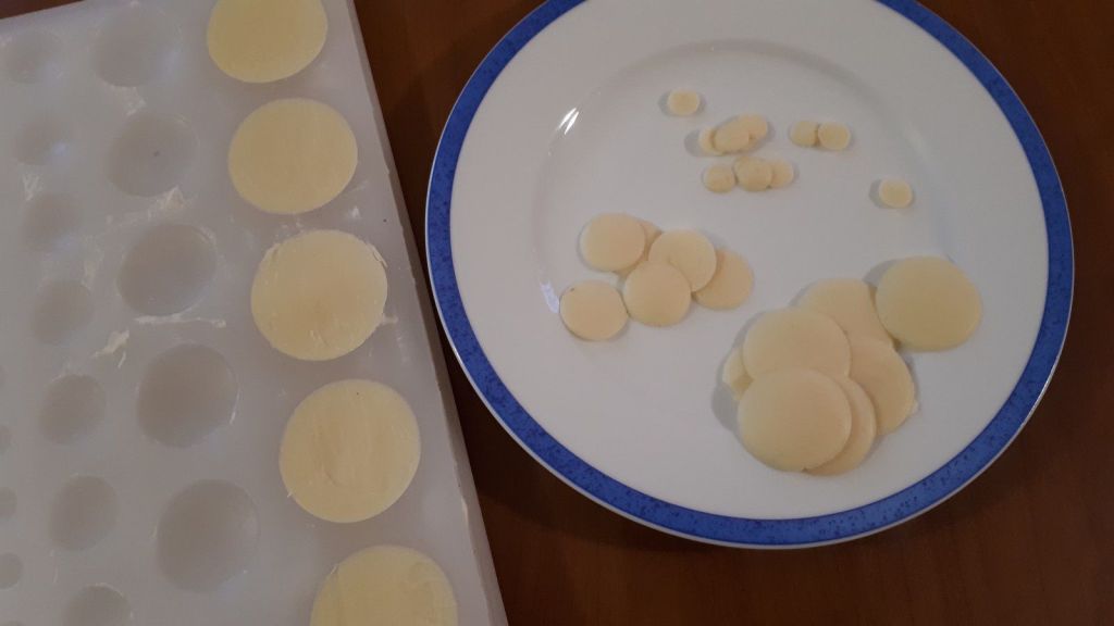 - Mélanger votre chocolat puis le mettre dans vos empreintes, si vous n’avez pas d’empreintes, le lisser sur une feuille guitare puis à l’aide de douille de différents diamètres vous pourrez faire vos cercles dans votre chocolat.