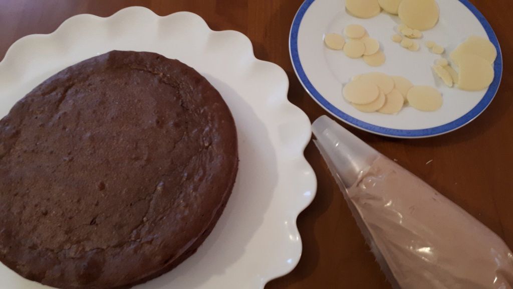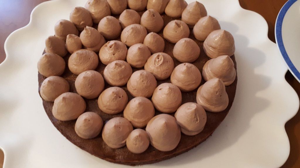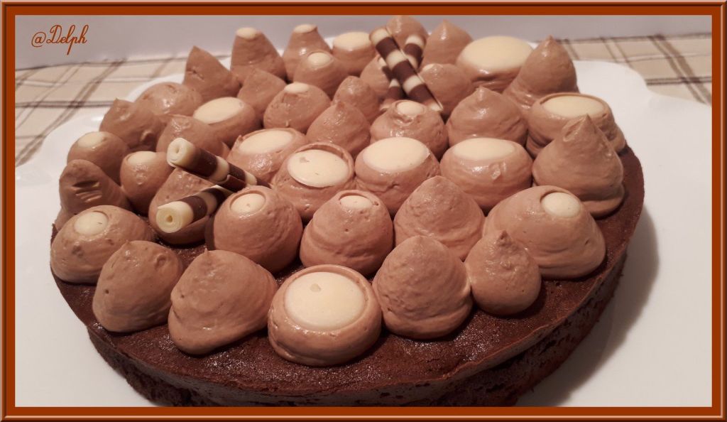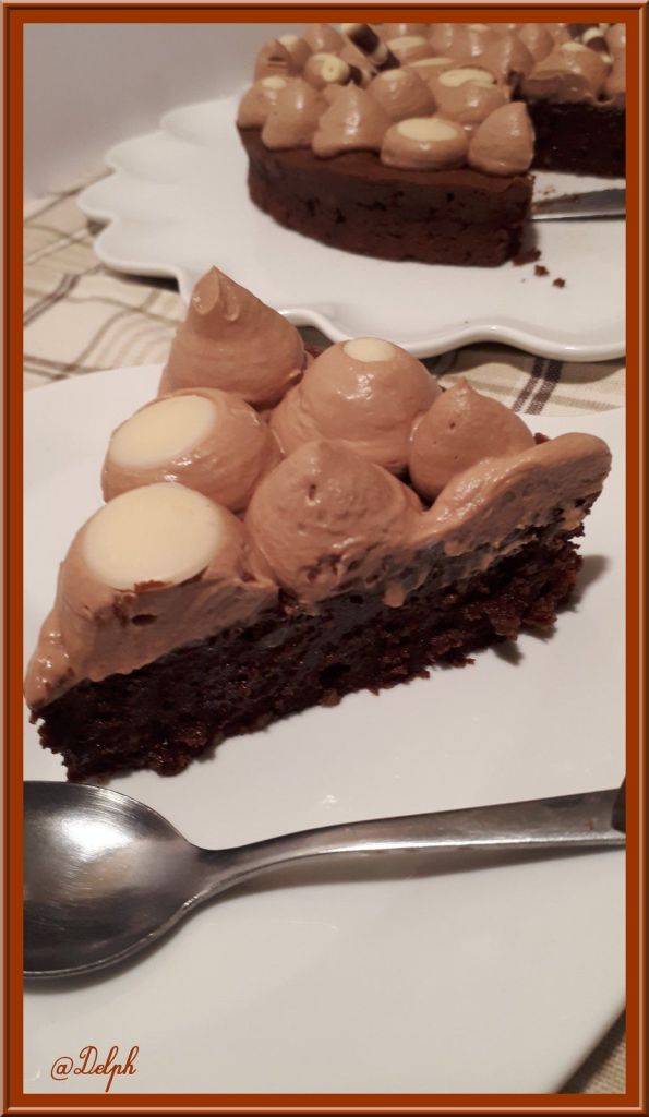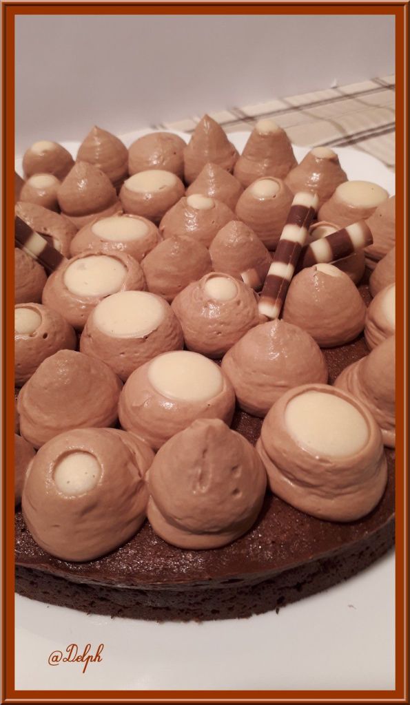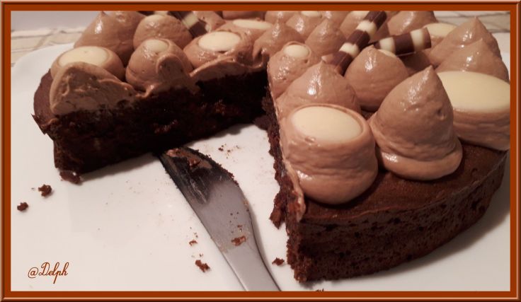 - Lorsque votre Brownie est bien froid, monter votre ganache, la mettre dans une poche à douille lisse, puis pocher sur la surface de votre brownie, enfoncer délicatement quelques cercles de chocolat.