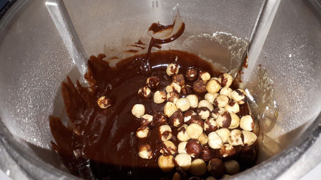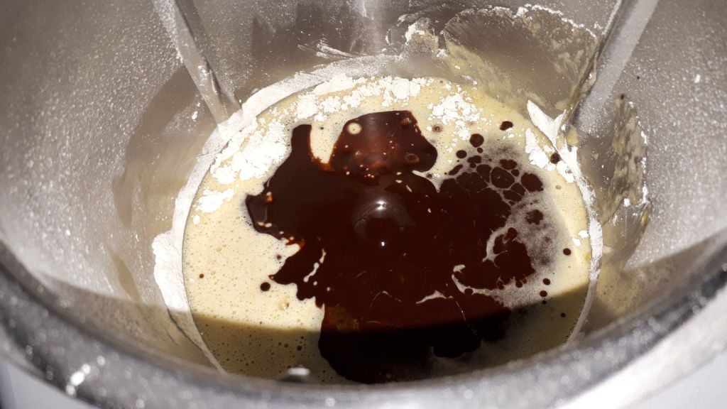 - Mettre les œufs et le sucre dans le bol puis mélanger 1 min/vit3, ajouter la farine, la maïzena, la fleur de sel puis mélanger 30sec/vit3, ajouter le chocolat fondu puis mélanger à nouveau 30sec/vit3, incorporer les noisette puis mixer 30sec/vit4, si vous souhaitez des éclats de noisettes plus gros ne mixer que 15 secondes.