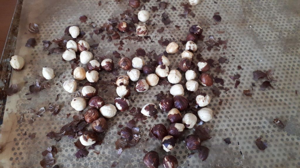 - Placer les noisettes sur une plaque de four et les faire torréfier à 140°C environ 10 minutes. Laisser refroidir puis enlever la petite peau en les frottant entre elles. Les déposer dans un sac plastique et taper dessus avec un fond de casserole pour les concasser. Réserver.