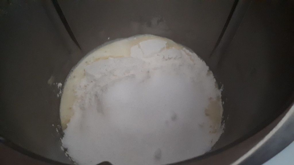 - Mettre le beurre en morceaux dans le bol puis faire fondre 2 min/80°CVit2, ajouter dans cet ordre le lait, le sucre et l’œuf puis mélanger 30sec/vit4.