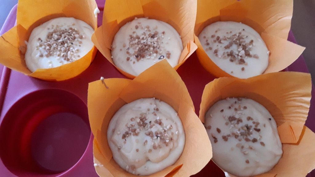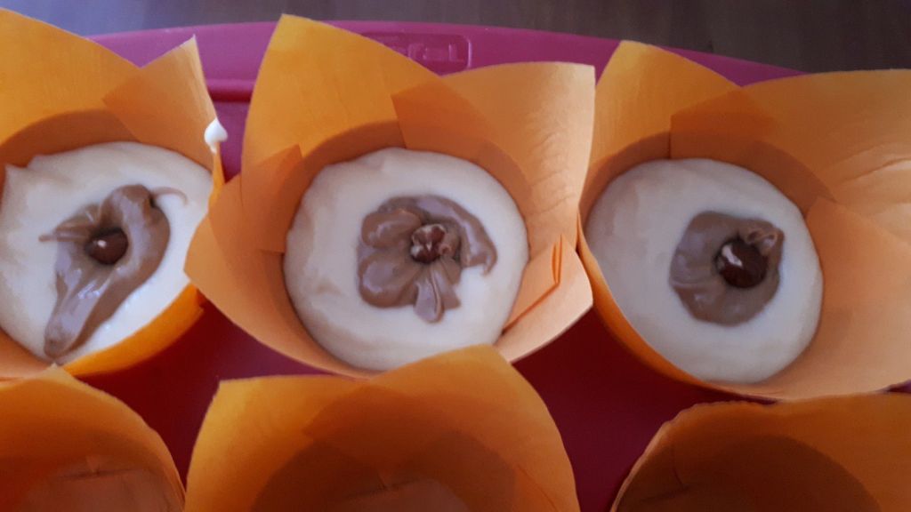 - Verser le mélange dans vos moules aux 3/4, déposer 1 c à c de pâte de pralin puis enfoncer une noisette, compléter par un peu de pâte.