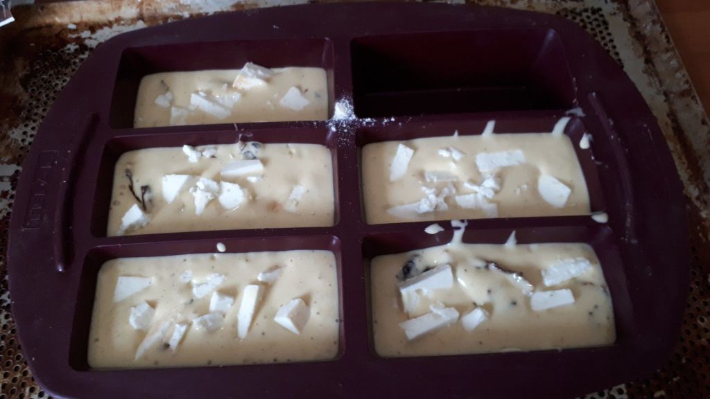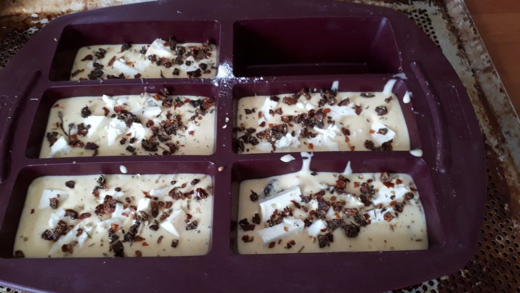 - Repartir dans un moule à mini-cakes. Détailler la feta en petits bouts et la répartir dans les moules. Saupoudrer le dessus des cakes avec le mélange provençal.