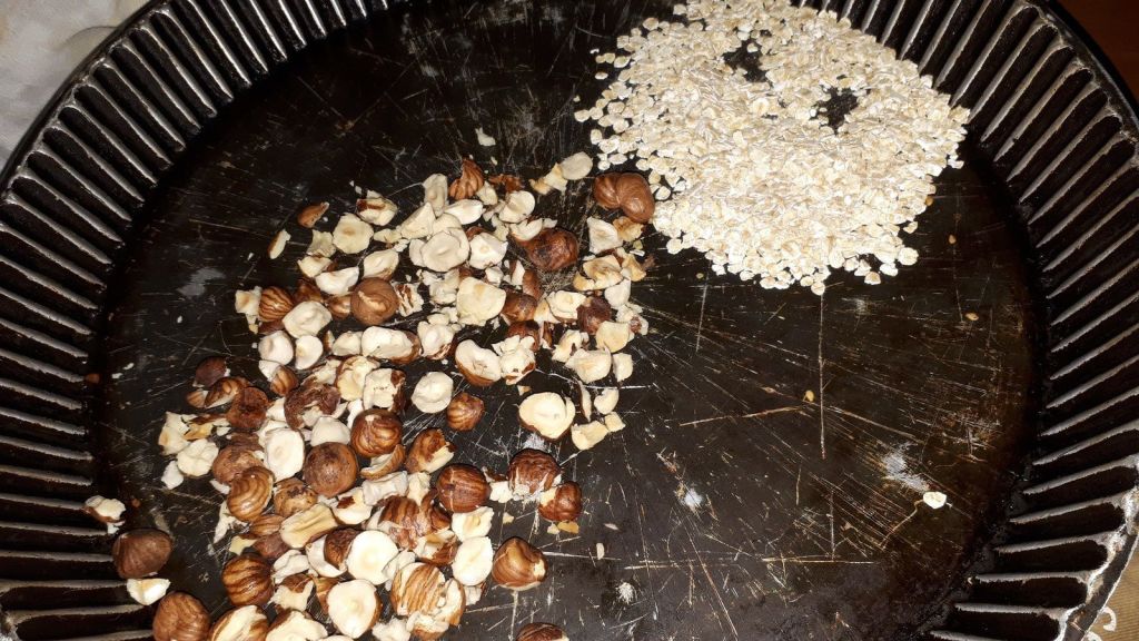 - Déposer les flocons d’avoine supplémentaires sur la plaque du four et faire chauffer 5 minutes, ajouter les noisettes grossièrement concassées ( j’utilise mon rouleau à pâtisser pour les casser) et prolonger la cuisson 5 minutes pour qu’elles soient légèrement dorées.