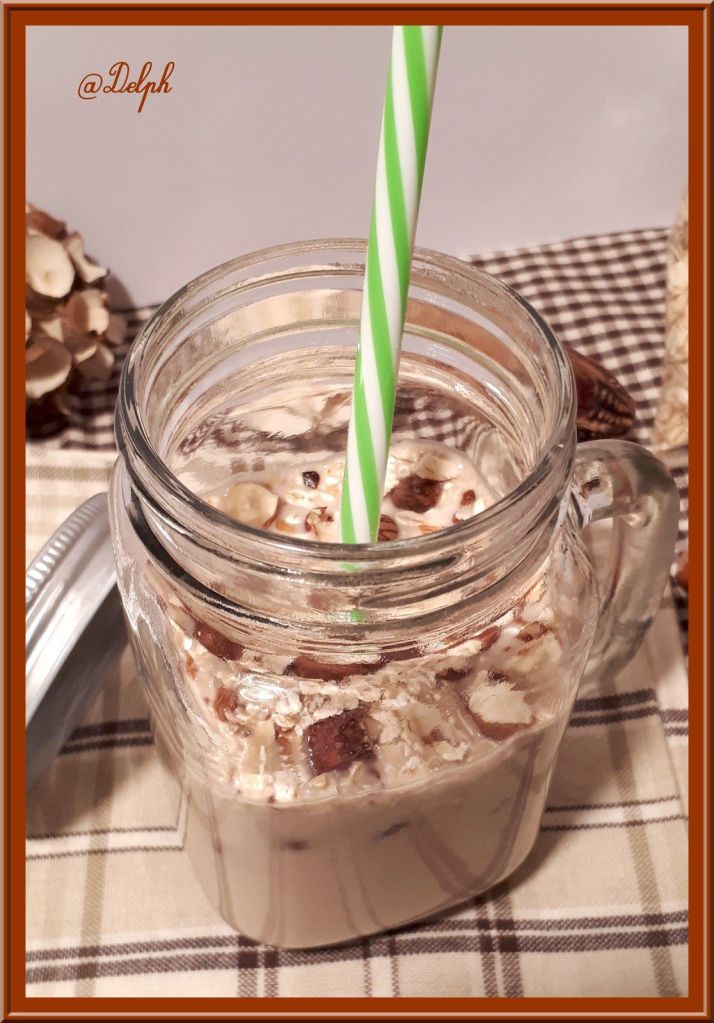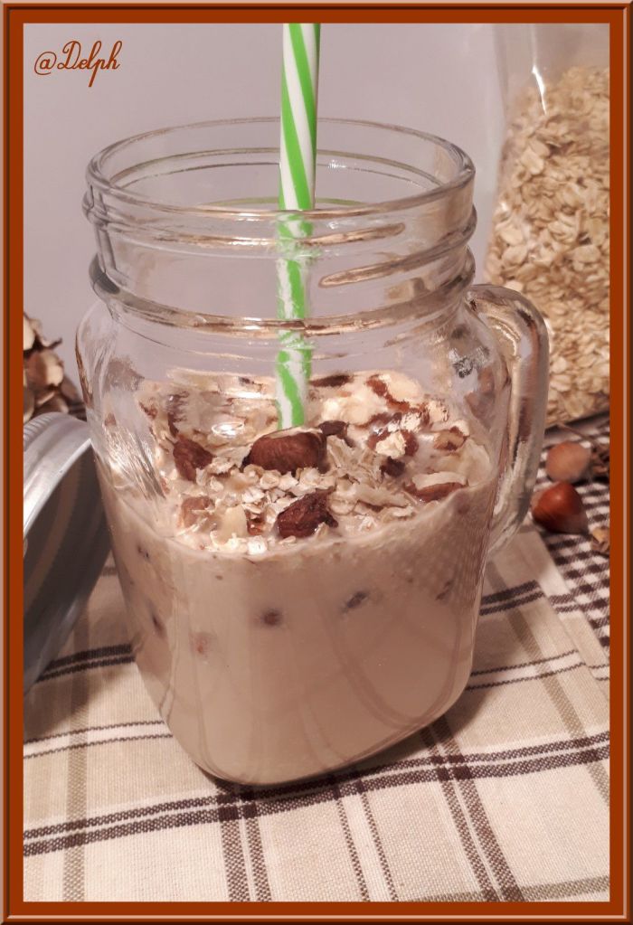 - Verser dans votre verre et saupoudrer de noisettes et flocons d’avoine.