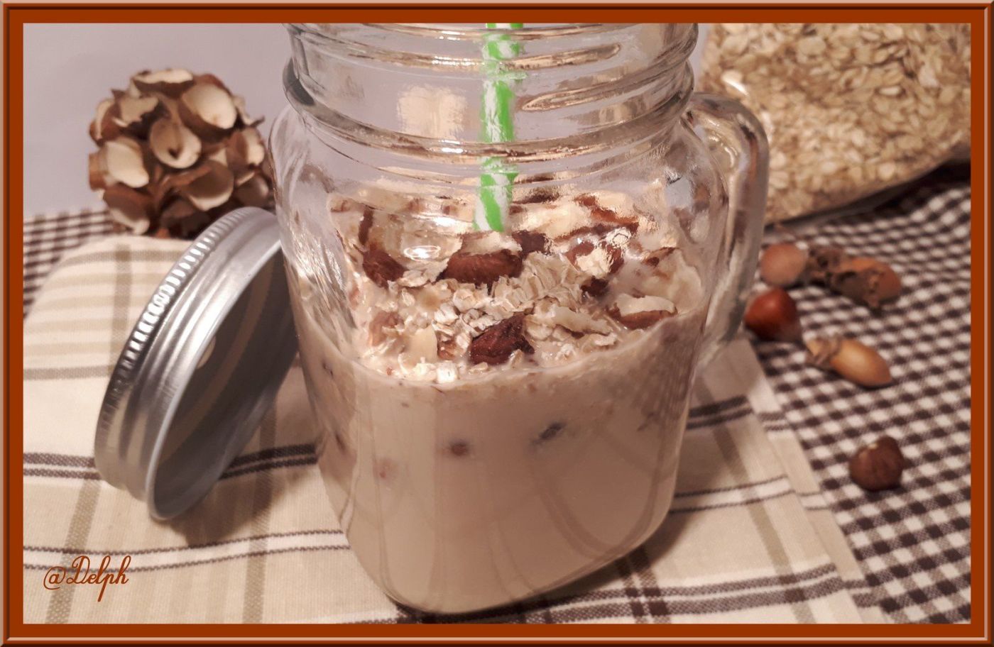 - Verser dans votre verre et saupoudrer de noisettes et flocons d’avoine.