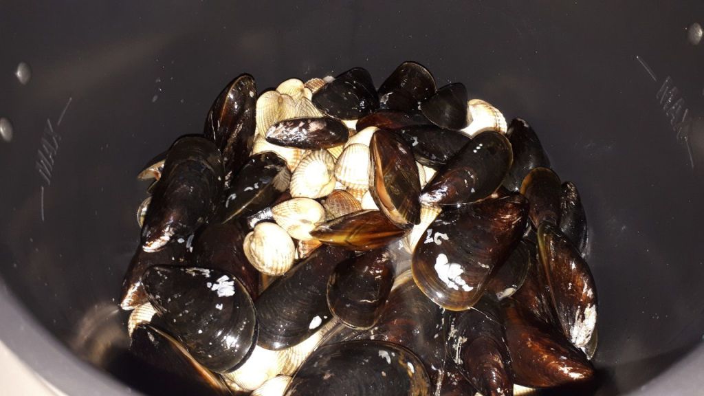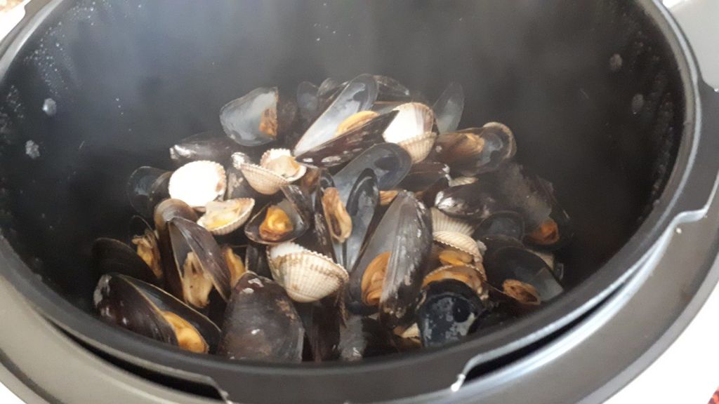 - Éplucher et ciseler votre échalote, éplucher et dégermer votre gousse d’ail puis la hacher, les déposer dans votre cuve avec l’huile, lancer le mode dorer, laisser colorer tout le préchauffage, puis ajouter le vin blanc et les coquillages, assaisonner, lancer le mode sous pression pendant 3 minutes.