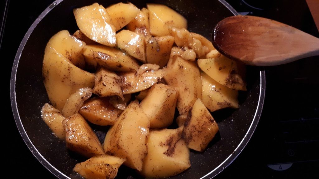 - Éplucher et couper votre mangue, la mettre dans un poêle anti-adhésive puis saupoudrer de sucre vanillé, et de poudre de vanille, la faire caraméliser en mélangeant délicatement, cela ne doit pas se transformer en compote.