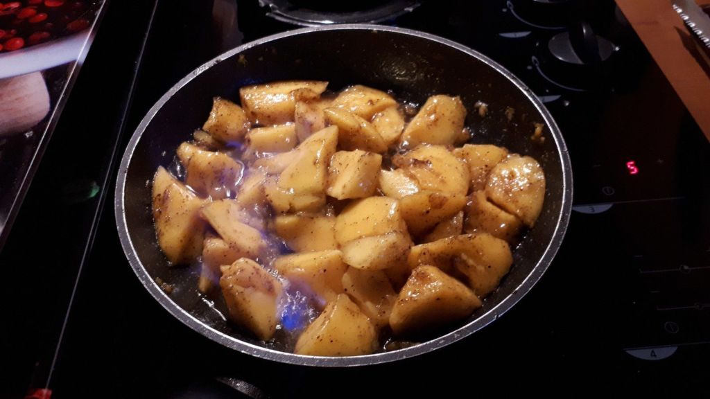 - Arroser de rhum, puis flamber, et mélanger jusqu’à ce qu’il n’y ait plus de flammes.