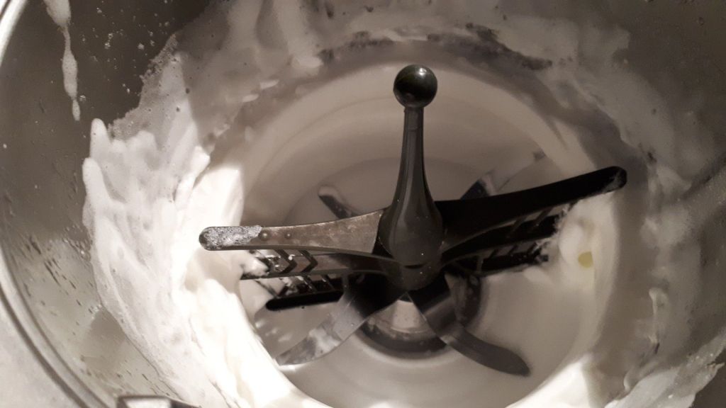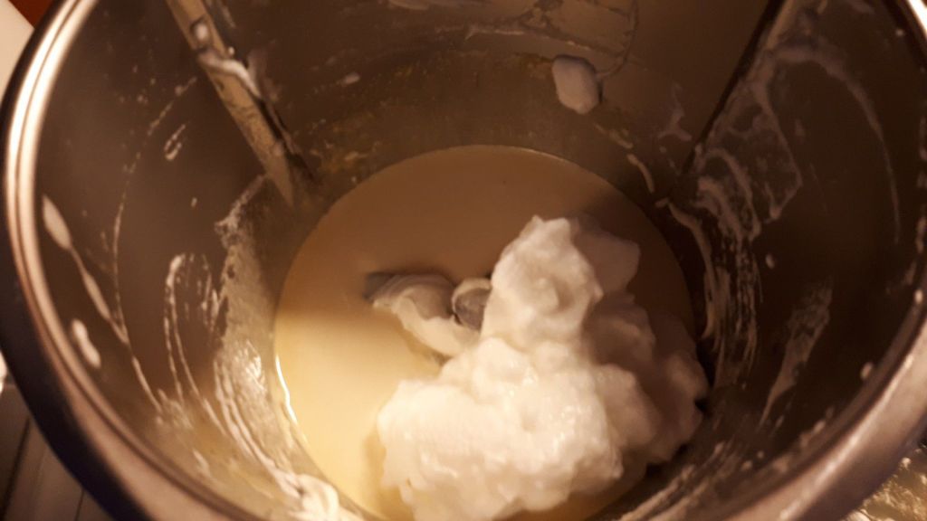 - Mettre les blancs avec une pincée de sel dans le bol puis donner deux coups de turbo, insérer le fouet puis programmer 3min/vit3,5 sans le gobelet, réserver, inutile de rincer le bol.
