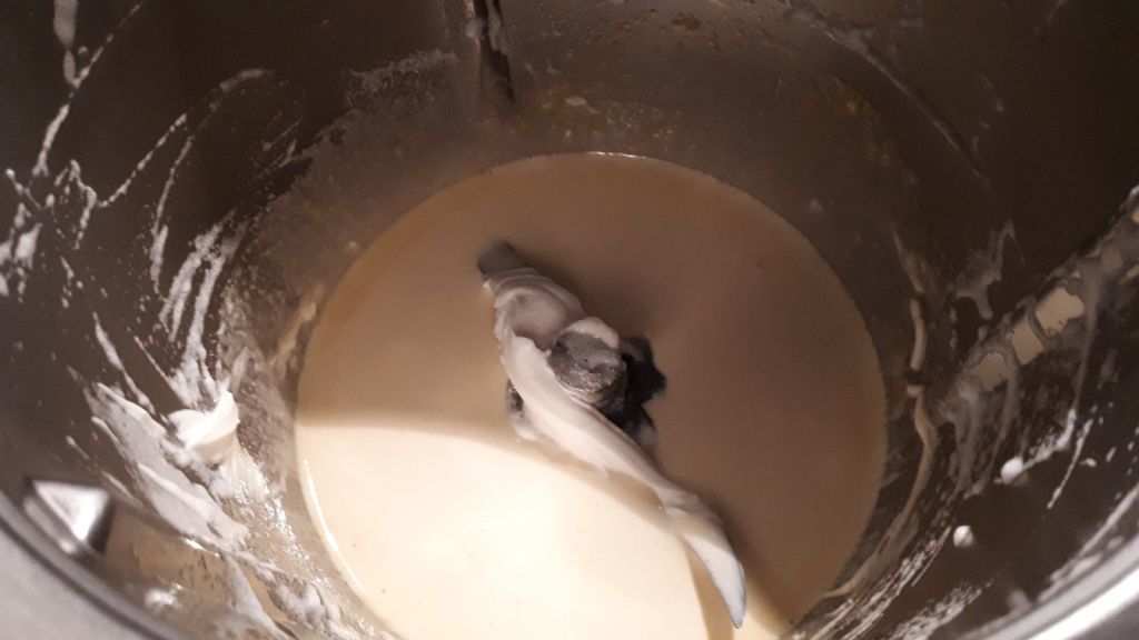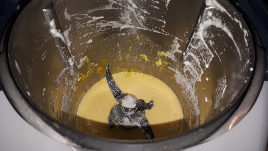 - Mettre les jaunes et le sucre avec le fouet puis mélanger 1min/vit3; incorporer le mascarpone en le mettant de chaque côté du fouet puis mélanger 40sec/vit3.