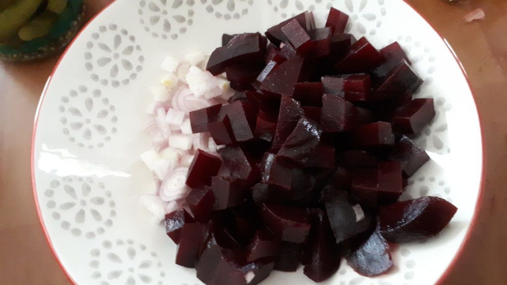 - Verser les dés de betteraves dans un grand saladier. Éplucher l’échalote, enlever son germe et l’émincer. L’ajouter dans le saladier.