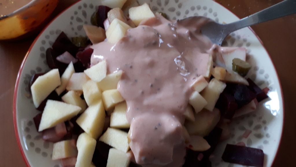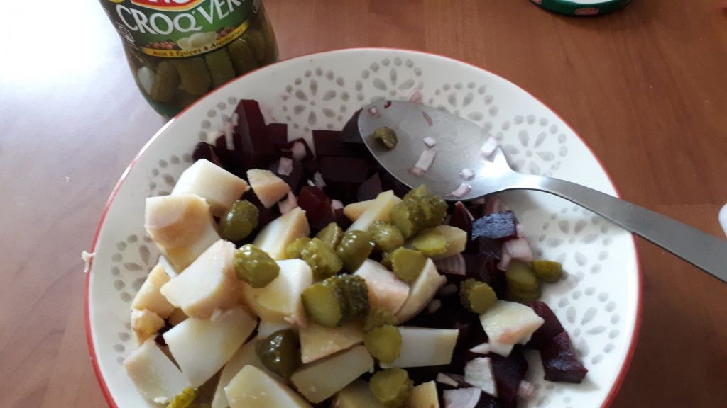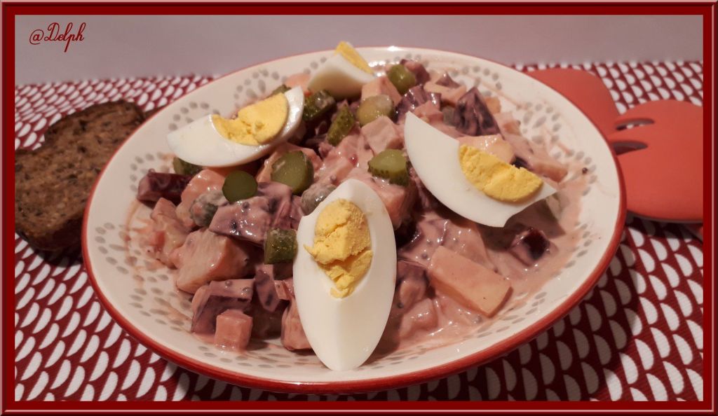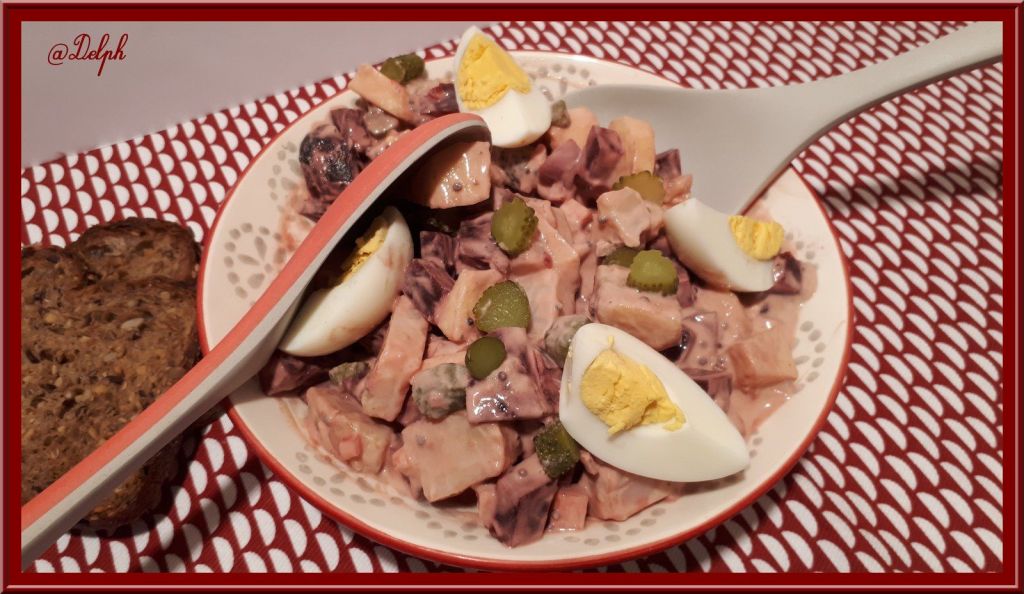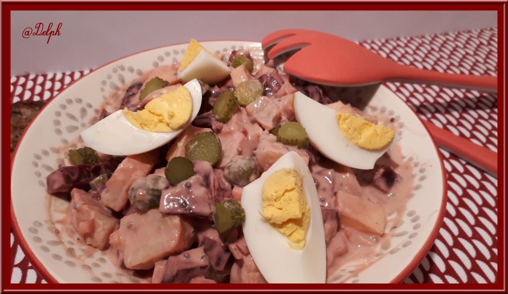 Voici une recette que j’ai piochée chez mon adorable Martine du blog Kilomètre 0. J’adore les betteraves, je suis la seule à la maison, mais comme je mange souvent des petites salades pour le midi, j’ai pu me faire plaisir, j’ai diminué un peu les quantités pour moi. J’ai juste modifié un peu la sauce en mettant du fromage blanc à la place de la crème fraîche et j’ai mis de la moutarde aromatisée au Cassis, mais vous pouvez mettre de la normale.