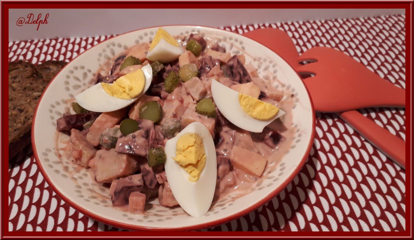 Voici une recette que j’ai piochée chez mon adorable Martine du blog Kilomètre 0. J’adore les betteraves, je suis la seule à la maison, mais comme je mange souvent des petites salades pour le midi, j’ai pu me faire plaisir, j’ai diminué un peu les quantités pour moi. J’ai juste modifié un peu la sauce en mettant du fromage blanc à la place de la crème fraîche et j’ai mis de la moutarde aromatisée au Cassis, mais vous pouvez mettre de la normale.