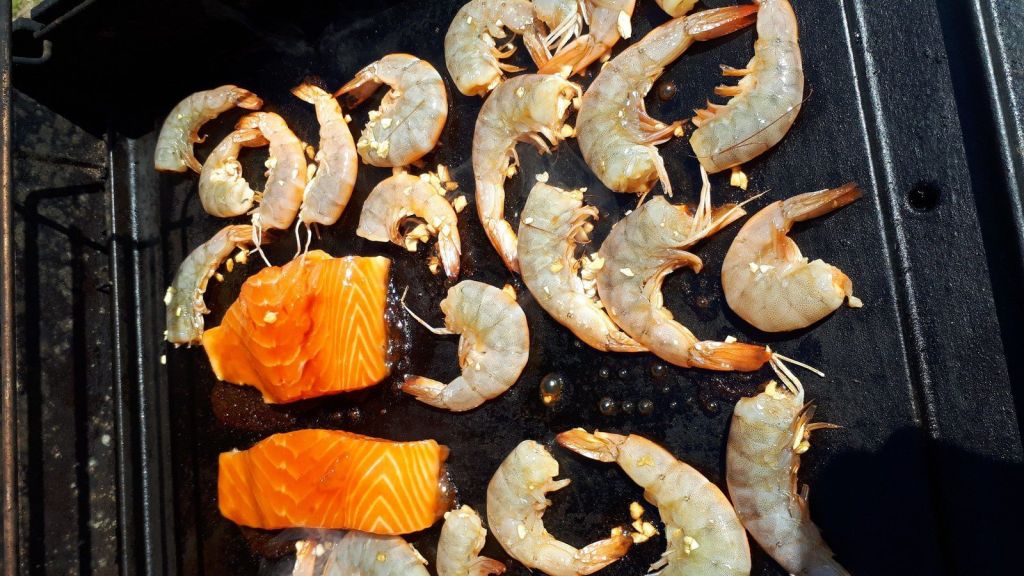 - Pendant ce temps commencer par faire chauffer sur la plancha pour nous, le saumon du côté peau pendant environ 10 minutes.