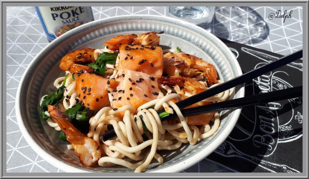 - Servir vos nouilles avec les crevettes et le saumon, saupoudrer de graines de sésame et remettre de la sauce si vous le souhaitez.