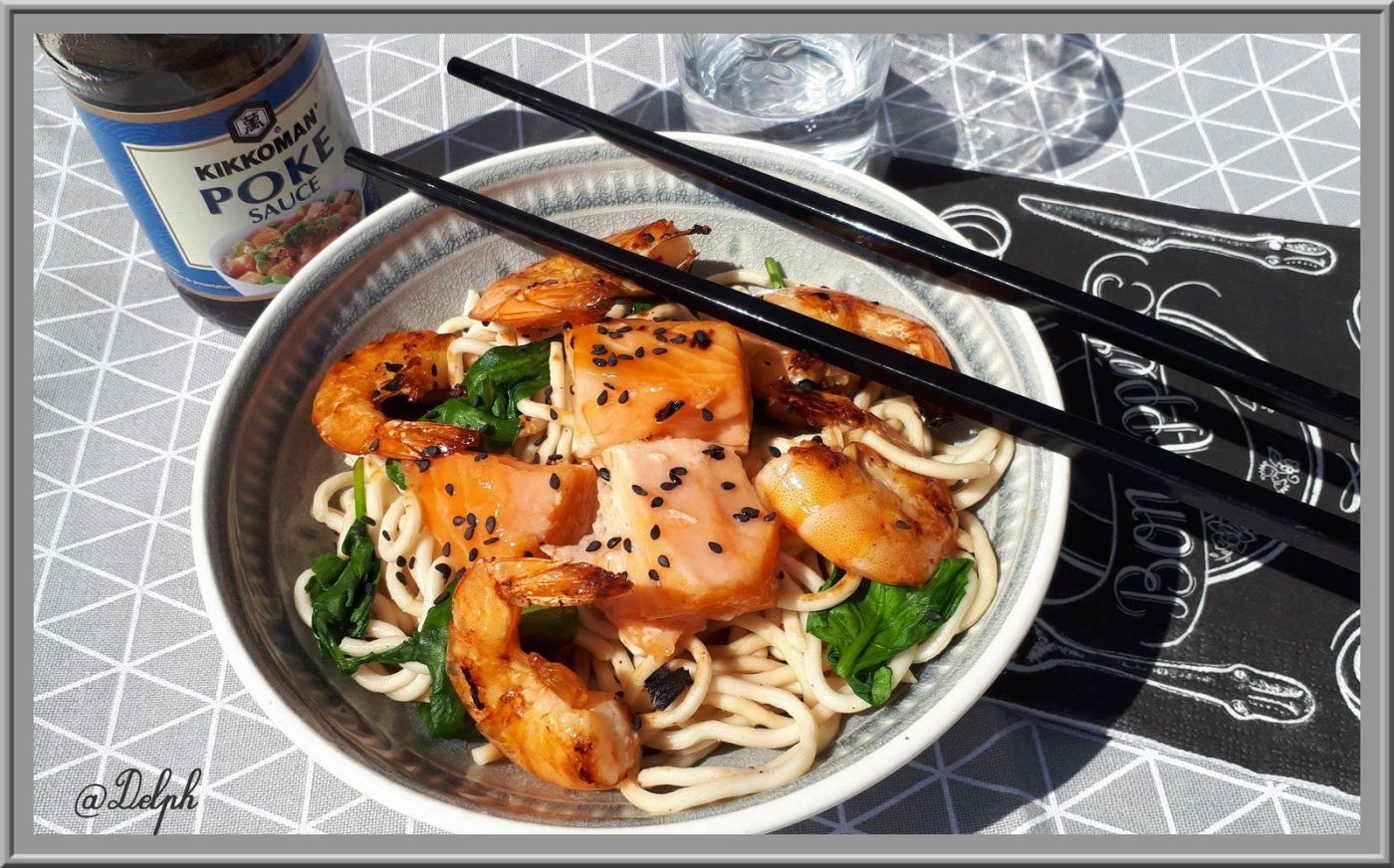 - Servir vos nouilles avec les crevettes et le saumon, saupoudrer de graines de sésame et remettre de la sauce si vous le souhaitez.