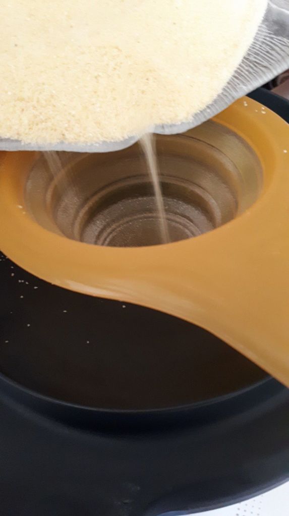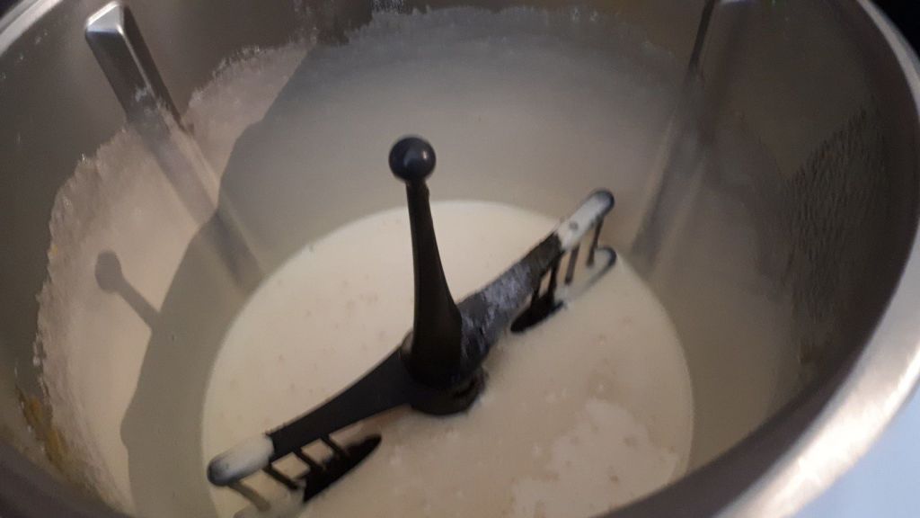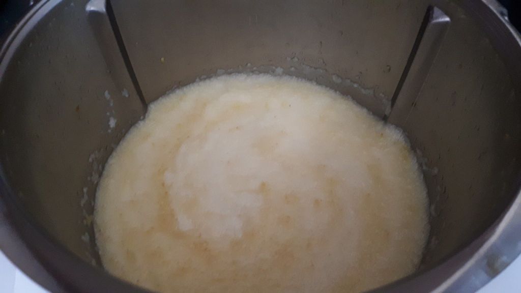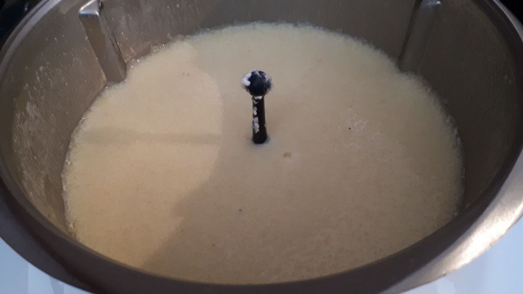 - Insérer le fouet dans le bol, mettre les œufs et le sucre puis programmer 2min/vit3 ajouter la ricotta laisser le fouet et mélanger 1min/vit3. Ajouter la semoule refroidie puis toujours avec le fouet mélanger 1min30/couteau inversé/vit2.